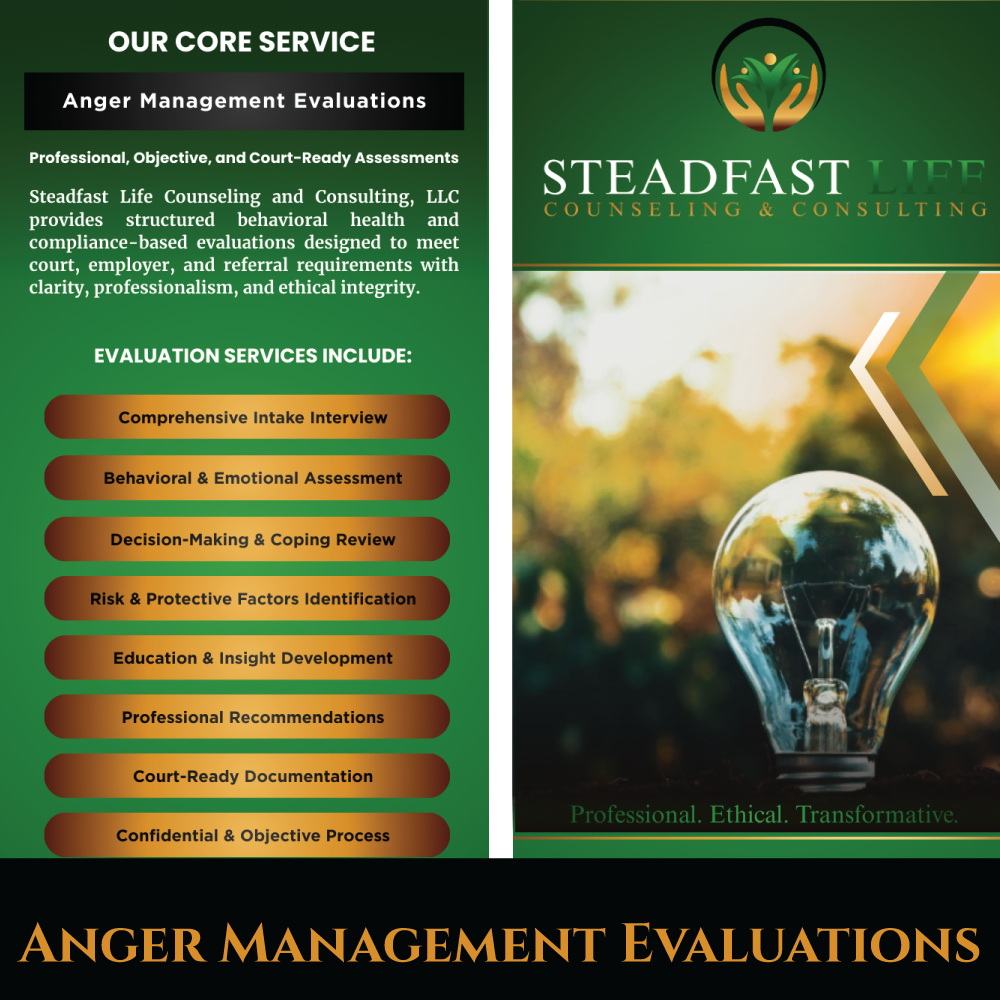 Steadfast Life Counseling and Consulting, LLC provides professional Anger Management Evaluations for individuals referred by courts ….