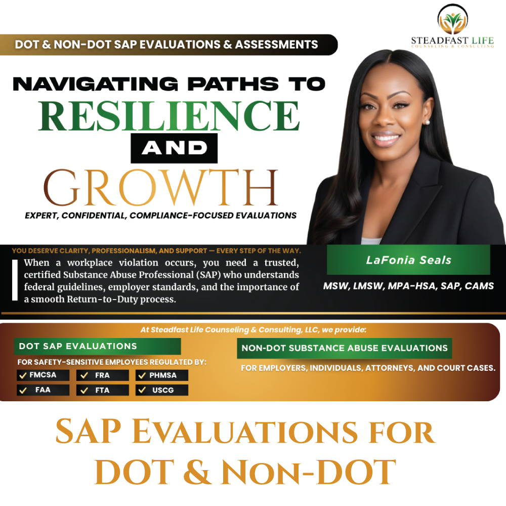 Steadfast Life Counseling and Consulting, LLC provides professiona Substance Abuse Professional (SAP) evaluations …