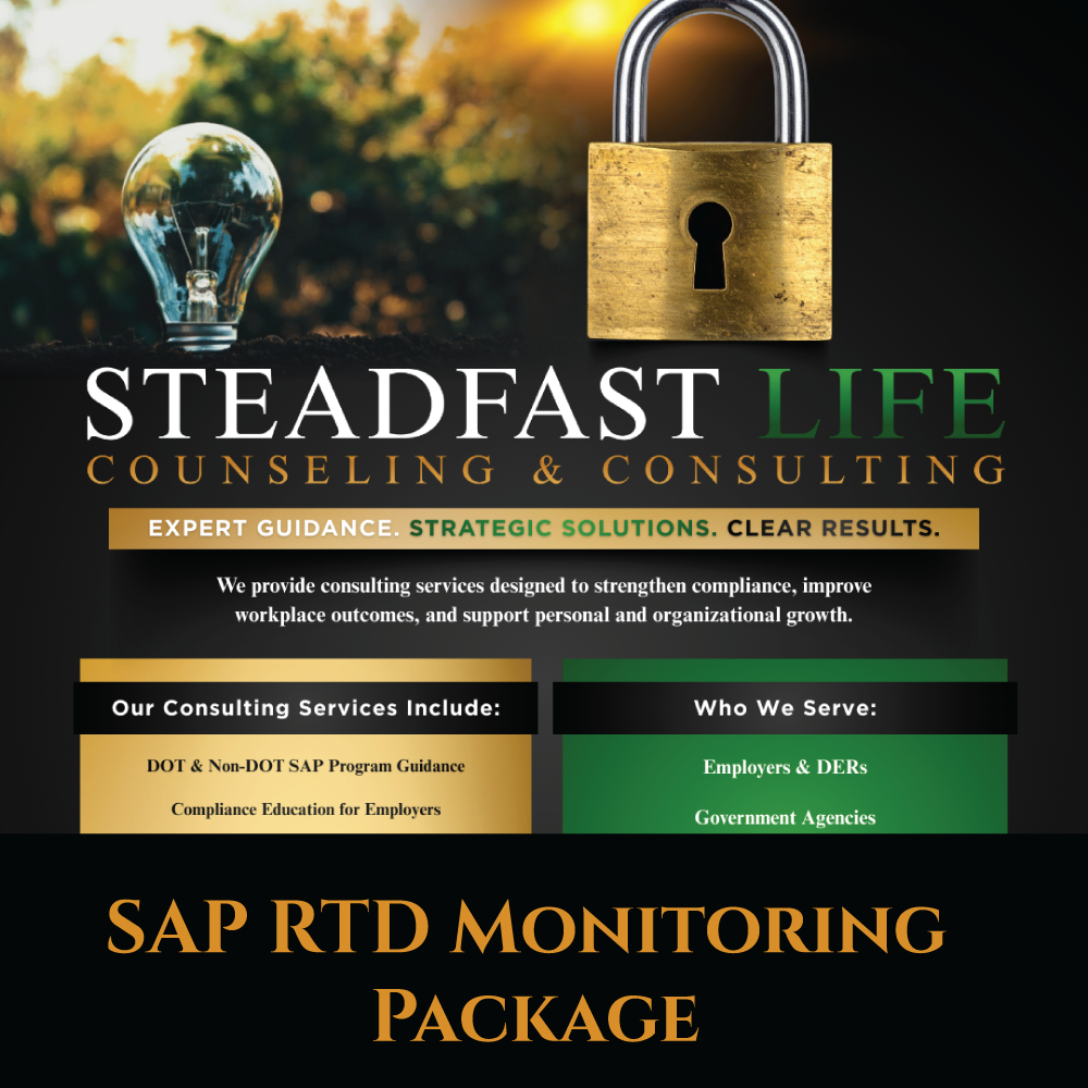 Steadfast Life Counseling and Consulting, LLC provides a comprehensive SAP Return-to-Duty (RTD) Monitoring Package ….